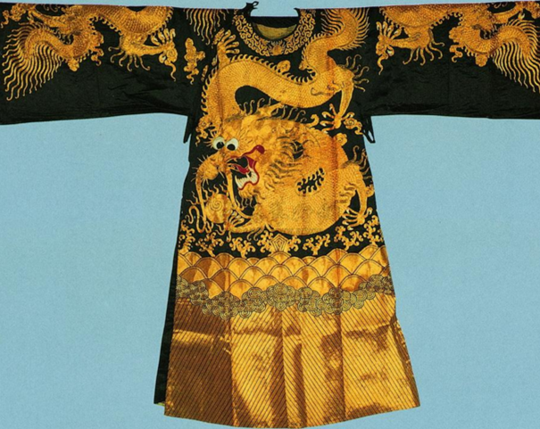 The Ming Dynasty Dragon Robe, though initially rejected by the Manchu emperors of the Qing Dynasty (Ming Dynasty emperors were of Han origin), was eventually embraced with a vengence, as it were, by Qing Dynasty emperors, during which period the Dragon Robe reached its pinnacle as an article of fashion clothing among China’s emperors. By this time, there were also Dragon Robes for all high-ranking public officials, as well as Dragon Robes even for some lesser-ranking public officials.