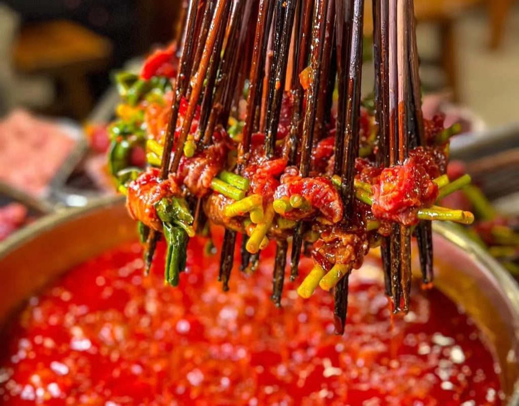 A portable version of hotpot—ingredients skewered on bamboo sticks, dipped, and eaten right away.